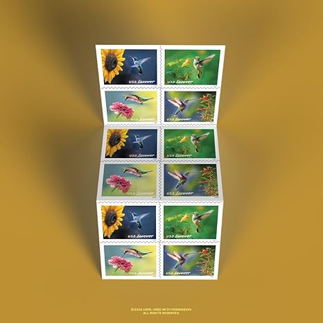 Each stamp features a close-up photograph of a single, female ruby-throated hummingbird hovering next to a colorful bloom, a zinnia, cigar flower, spotted touch-me-not, or sunflower.